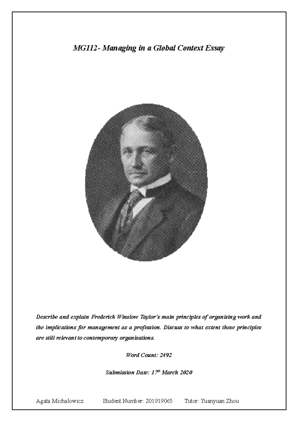 Frederick Taylor S 4 Principles Of Management Mg112 Managing In A Global Context Essay Describe Studocu